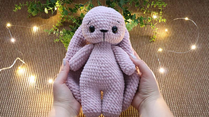 Этот милый зайчик станет отличным другом для ребенка или уютным украшением вашего дома. Вязаный вручную из чрезвычайно мягкой плюшевой пряжи, он приятен на ощупь и безопасен даже для малышей. Глаза на безопасном креплении. высота: 25 см