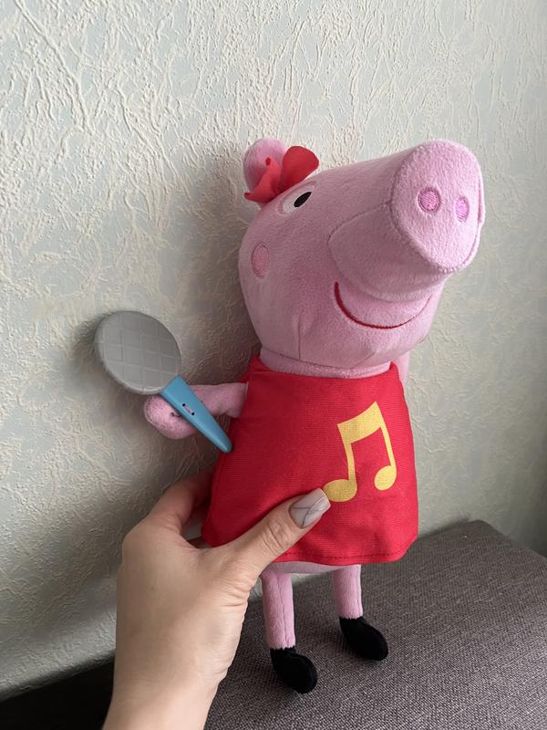 М'яка музична іграшка Свинка Пеппа від Hasbro! Чарівна Пеппа (висота 28 см) видає кумедні фрази, сміється та співає пісеньки. Одягнена в мерехтливу червону сукню з милим бантом, м’яка та приємна на дотик! Купляла в Німеччині