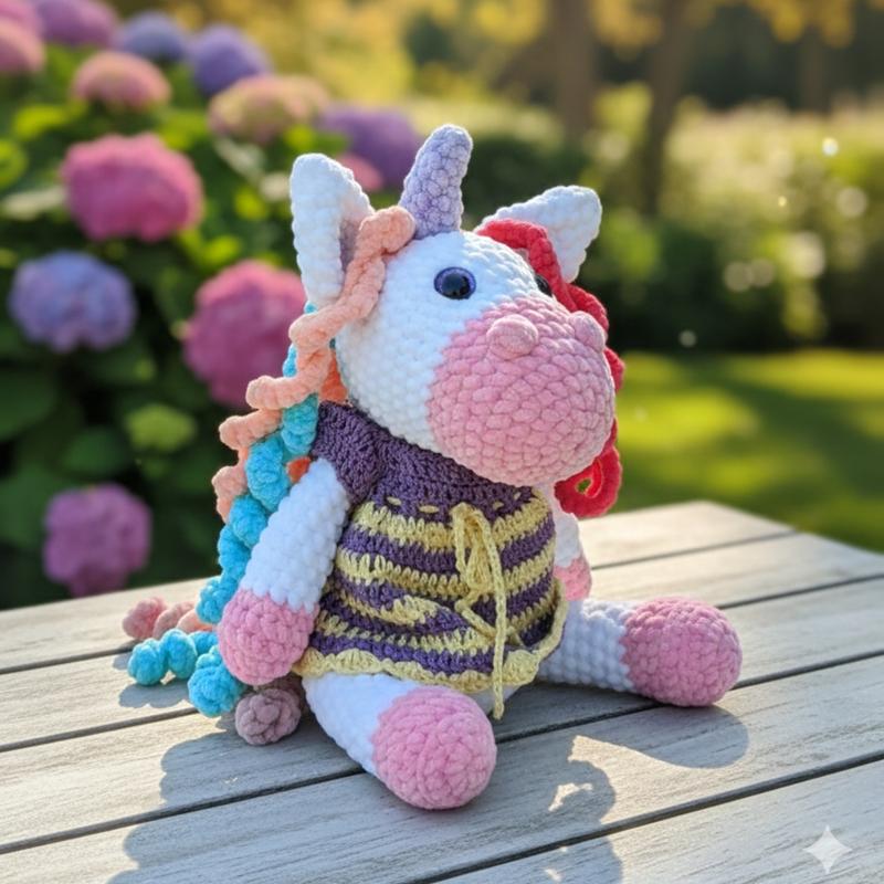 Плюшевая игрушка Единорог Игрушка связана из плюшевых нитей, а платье связано с хлопковых нитей. Глаза на безопасном креплении. Высота игрушки в полном рост - 34см Высота в сидячем положении - 26см.