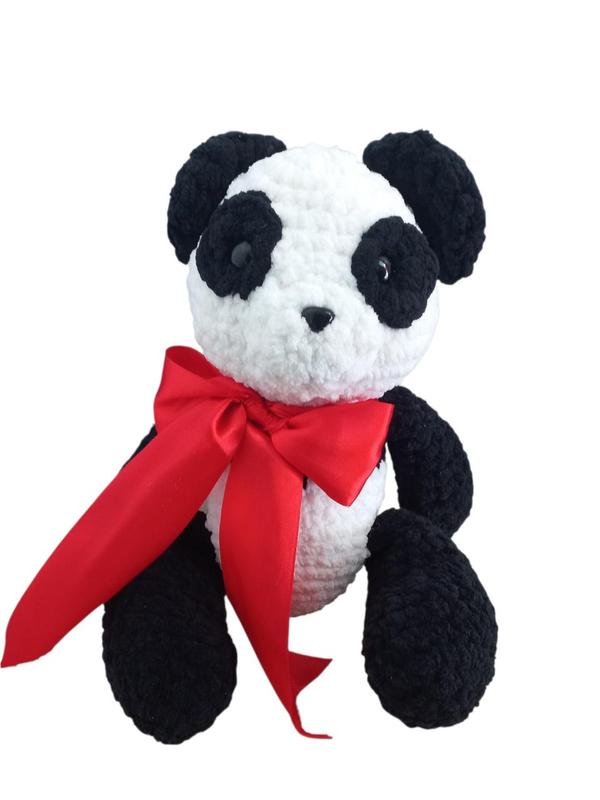 Мягкая игрушка "Панда с бантом" Приятная на ощупь. Все детали игрушки пришиты, поэтому абсолютно безопасны для малышей. Высота 32 см. Бескаркасная игрушка. Без опоры стоять и сидеть не может. Связана с пряжи Velluto, наполнение холофайбера, ячейки на безопасном креплении. Рекомендуемая ручная стирка в теплой воде с легким отжимом.