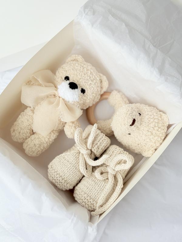 Вʼязаний ведмедик, колір дивіться на першому фото , там найбільш він відповідає дійсності, до 18 см, вартість вказана тільки за іграшку ведмедика, якщо потрібен набір пишіть в повідомлення
