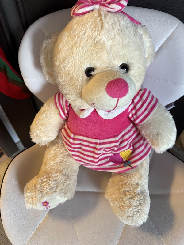 М'яка іграшка. Виготовлений із плюшу та наповнювача (наприклад, холлофайбер або синтепух). Одягнений у рожево-білу смугасту сукню з бантиком на голові. На лапах та сукні є вишивка у вигляді квітів та серця.