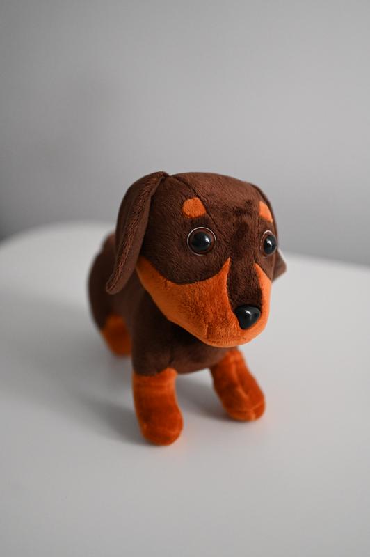 Іграшка має подовжений корпус і короткі лапи, характерні для такс. Вона виконана в коричневому кольорі з рудими або помаранчевими вставками на лапах, морді та вухах. Подібні м'які іграшки зазвичай виготовляються з м'якого плюшу або мікроплюшу, а наповнювач складається з гіпоалергенного холлофайбера або синтепуху.