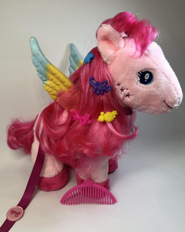 М'яка іграшка поні Барбі Пегас, має функцію самостійного пересування, яка також активує її крила. Просто потягніть за повідець і спостерігайте, як рухаються її лапки та тремтять крила! Щоб ще більше посилити чари, плюшева іграшка під час прогулянки співає чарівну пісню Барбі «Дотик чарівництва»! Розчешіть її довгу гриву та хвіст за допомогою доданого гребінця, а потім проявіть творчий підхід і прикрасьте її трьома яскравими шпильками.