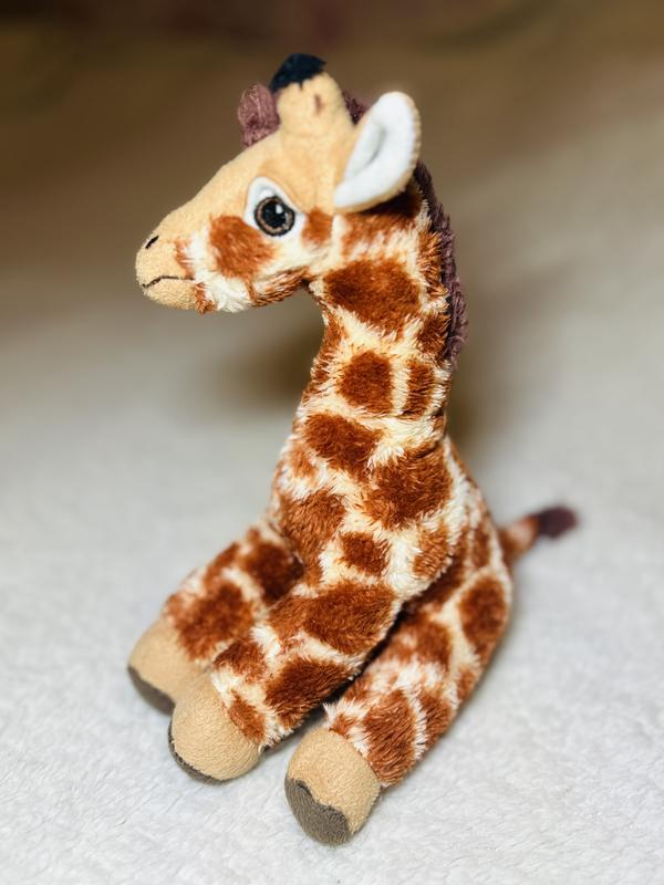 Іграшка на зображенні належить до лінійки EcoBuddiez від бренду Deluxebase. Це м'яка іграшка у формі жирафа, яка виготовляється з перероблених пластикових пляшок. Використовуються 100% перероблена тканина та наповнювач; пластикові гранули відсутні. Очі жирафа вишиті, а не зроблені з твердого пластику, що робить іграшку безпечнішою для маленьких дітей. Іграшка виробляється компанією Deluxebase, яка спеціалізується на розробці екологічно чистих іграшок та подарунків.