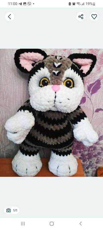 Изготовлен из гипоаллергенной плюшевой пряжи Глаза на безопасном креплении Наповнювач холофайбер В лапке есть пищалка Ручки подвижные (на суставах) Рост 30см.