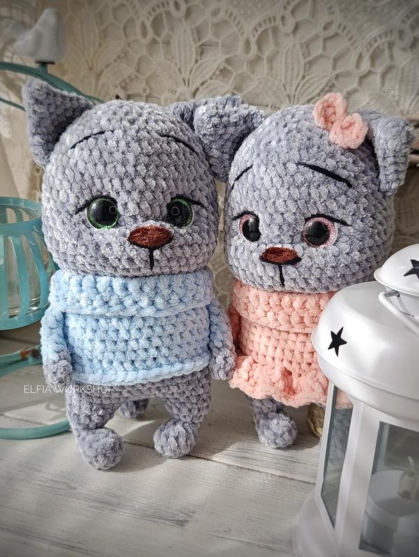 🐾 Котики-парочка ✨ Они будто созданы друг для друга 🤍 Серый кицтик в свитерике и нежная киса в платье - маленькая теплая парочка, которая дарит уют с первого взгляда 🐱🐱 Вязаные из мягкой велюровой пряжи, очень приятные на ощупь Их можно подарить как символ заботы, нежности и домашнего тепла ✨ Характеристики: ▫️ Велюрова пряжа ▫️ Высота каждого - 20 см ▫️ Глаза на безопасном креплении ▫️ Наполнение - холлофайбер ▫️ Ручная работа Котиков можно приобрести отдельно или вместе как очаровательную пару 🤍 Вместе они выглядят особенно трогательно — будто маленькая история о любви и заботе.