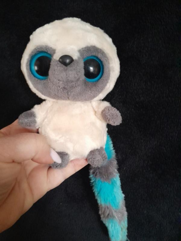 Мягкая игрушка YooHoo в виде белого лемура с голубым хвостом. Производитель: Aurora Серия: YooHoo & Friends (глазки с блестками) Размер: 15 см + хвост 17 см Особенности: большие глаза и мягкий пушистый хвост является притертость на глазке - малозаметная
