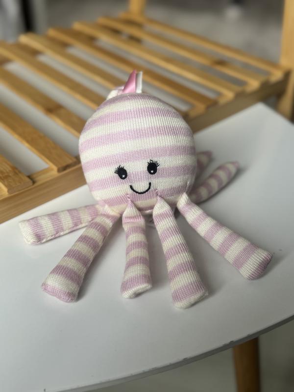 На фото — мʼякий джелі-кет (іграшка-підвіска) у вигляді рожевої медузи 🪼/восьминога. Іграшка з вібрацією та Це: • дитяча мʼяка іграшка • можна чіпляти на коляску / ліжечко / автокрісло • підходить для малюків 0+ • часто використовується як антистрес або декорвосьминога