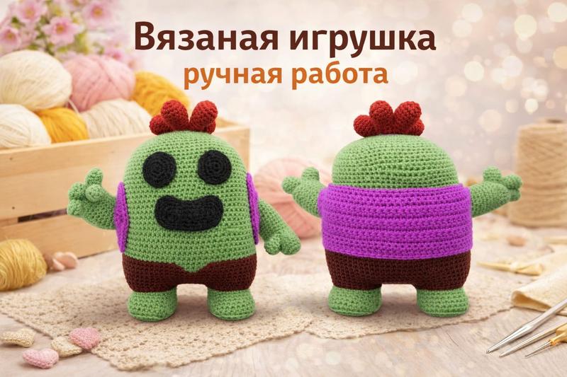 Игрушка ручной работы Спайк из известной игры Бравл Старс. Вязаная из полухлопка, наполненная штанфайкром, размер игрушки ~ 15 см.