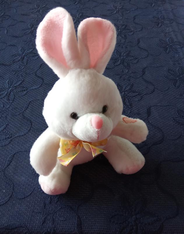 Белый музыкальный зайчик, звучит милодия если нажать на лапку. Высота 23 см.