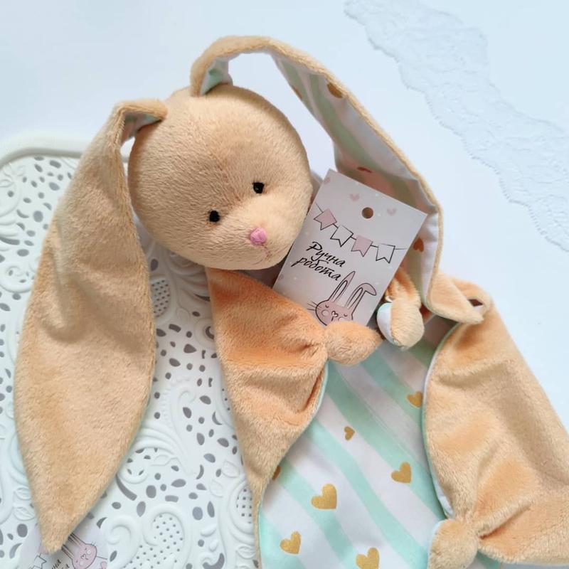 Милейший зайка-комфортер-первая игрушка для Вашей крохи. Такая мягенькая и забавная ,будет охранять сон, и убаюкивать малыша. Это также замечательный подарок для ребёнка родственников и друзей.Материал -хлопок и плюш.