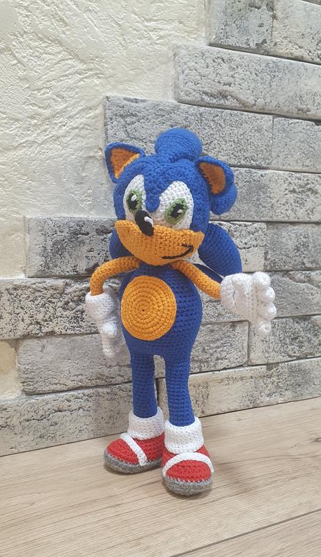 Вязаный Соник - герой игры Sonic the Hedgehog, а также популярных детских мультфильмов "Соник бум". Мягкая игрушка ручной работы, выполнена из детской хлопковой нити, наполнитель холлофайбер. Фигурка на каркасе, ручки двигаются. Размер -чуть больше 26-27см. В данный момент готовой работы нет, выполню под заказ. Могу связать другого персонажа по вашему заказу