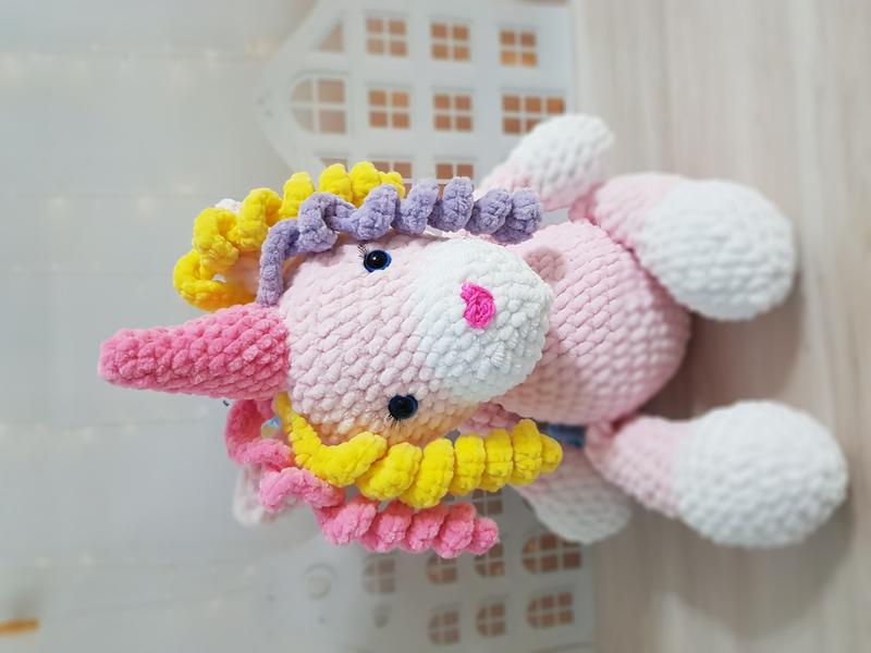 плюшевый единорог,выполненный из гипоаллергенных материалов. Длина изделия 37 см.