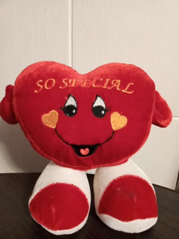 В ножці є пристрій, сердечко співало...але сіли батарейки. Висота 17 см, ширина з ручками 25.