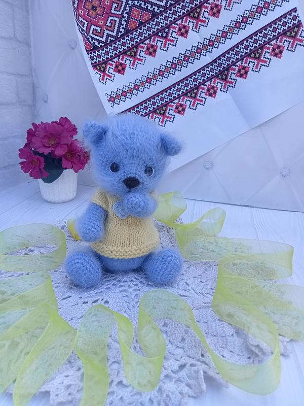 іграшка зв'язана із фантазійної пряжі наповнювач холофайбер, шукає собі домівку і нових друзів ,зростом 16см