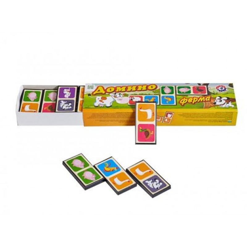 Домино "Ферма". Играют от 2-х до 4-х человек. Игроки должны положить фишку (кость), где есть наличие подходящего животного. Если такового нет, следует вытянуть карточку из "резерва". Выигрывает тот, кто завершает выкладку своих фишек (костей).