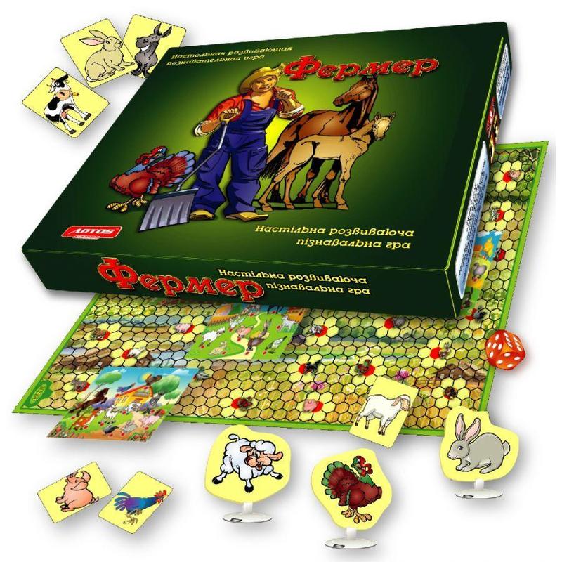 ФЕРМЕР - это настольная развивающая познавательная игра. Безусловно, целевой аудиторией этой игры являются дети. В игровой форме они учатся складывать и делить, оценивать риски и планировать, знакомятся с домашними и дикими животными. В процессе игры участники становятся фермерами каждый из которых развивает небольшое приусадебное хозяйство. ФЕРМЕР станет прекрасным подарком для Ваших малышей. Однако мы уверены, что взрослые тоже с удовольствием и искренним азартом не отрываясь проведут за игрой несколько партий. Также в игровой форме Вы сможете развить внимание у ребенка, логическое мышление, математические способности. У нас Вы можете купить замечательную развивающую игру Фермер и интеллектуально проводить время всей семьей! В комплект игры входит: - большое игровое поле, разбитое на ячейки - 1 шт.; - планшет - ферма - 4 шт., - фигурки домашних животных с подставками - 40 шт.; - карточки домашних животных - 40 шт.; - карточки диких животных - 20 шт.; - фишки пластмассовые - 4 шт.; - кубик - 1 шт.; книжка - инструкция - 1 шт Минимально рекомендованный возраст: 6+ Размер коробки: 29,5*33,5*6 см. Производитель: Украина. Кол-во игроков: 2-4 человека.