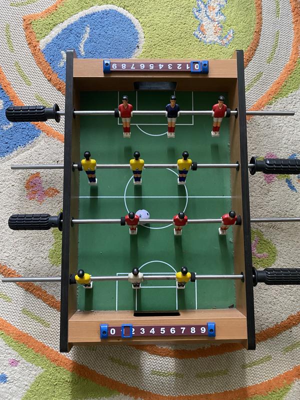 Настольный футбол шикарного качества, фигурки из качественного пластика тяжелого, основание прочное и устойчивое.Не хватает ручек по бокам( судьба их не известна) но играть вообще не мешает.