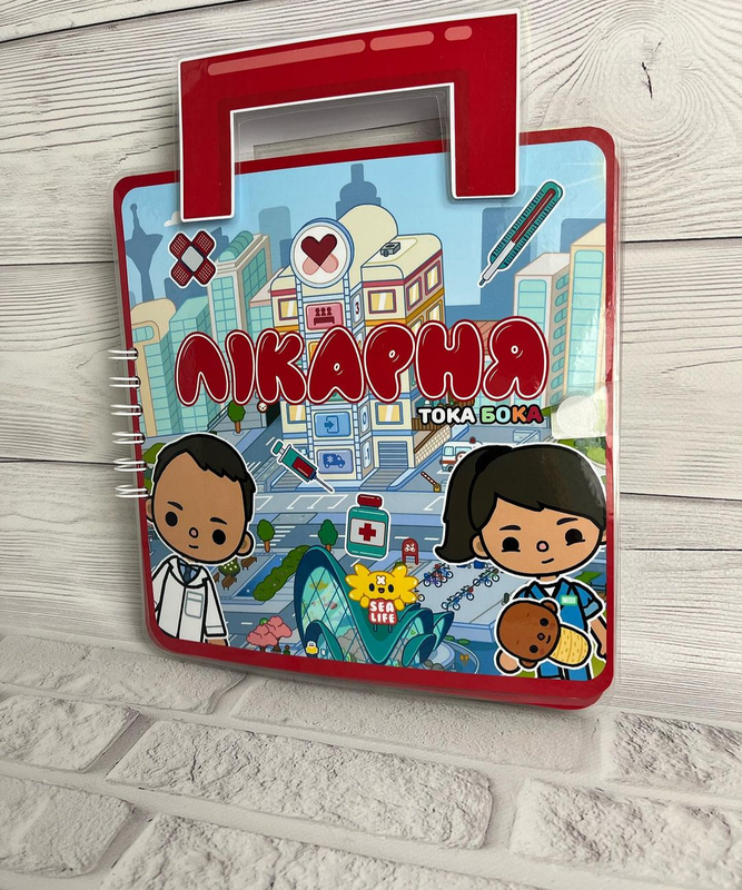 В комплект входить: 5 персонажів Швидка допомога Ванна кімната Операційна 2 палати Ігрова кімната Кухня Альбом виготовлений з глянцевого фотопаперу, заламінований у щільну плавку та зібраний на пружину