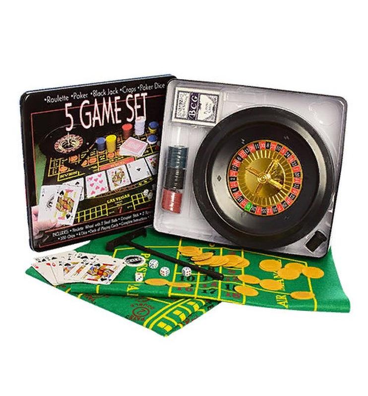 Настольная Игра D25354 (8шт) 5в1,Покер,Рулетка,Фишки,Карты,Кубики,Сукно2шт,В Кор(Металл),33-29-7см
