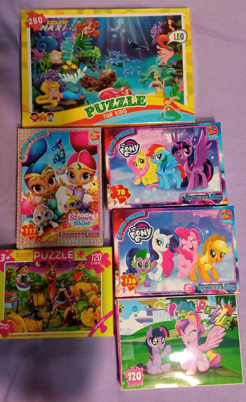 Тип іграшки: Пазли Торг Кілька примірників у наявності Пазли розвиваюча і дуже цікава гра для дітей у будь-якому віці. Пазли Літл Поні 70шт,120шт,126шт в оригінальній упаковці, Шімер і Шаїн 117шт., Принцеси 120шт по 55 грн. Русалочки 260шт. 70грн. При покупці всіх лотів - знижка гарантована.