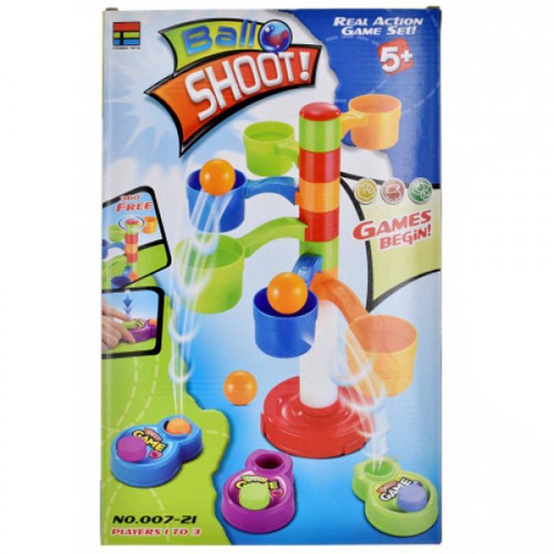 Тип іграшки: Настільні ігри Настільна гра "Ball Shoot" - гра з м'ячиками, в яку можуть грати від 1 до 3 гравців віком від 5 років. Помістіть м'ячик в катапульту, націляйтесь і натисніть на кнопку. М'яч автоматично вилетить. У разі успіху, м'яч потрапить в чашку. Кожна чашка має різну кількість очок. Перемагає той, хто набере більше очок. У комплекті: - 1 стенд; - 3 катапульти; - 12 м'ячів.