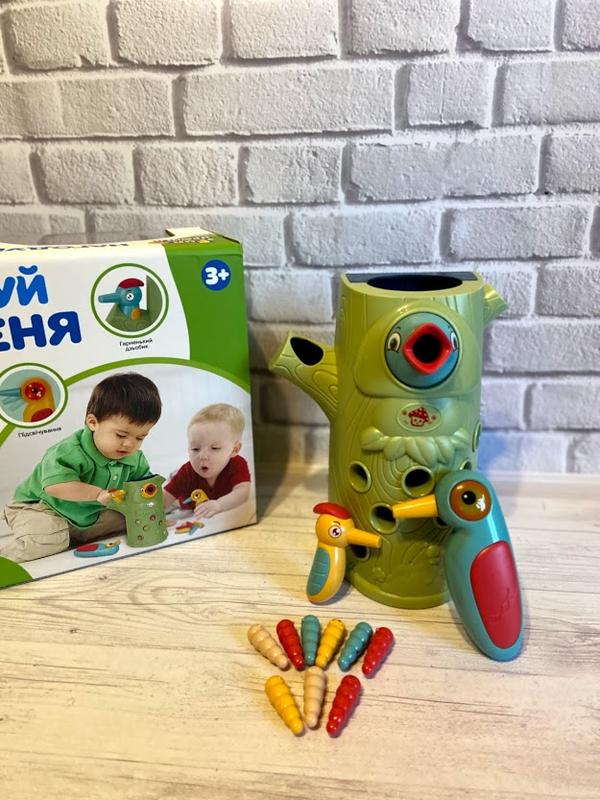 Увлекательная детская магнитная игра "Накорми птичек" представлена в стильном и современном дизайне, который сочетает в себе нежную палитру пастельных цветов и приятны на ощупь детали. Дерево в котором сидит птичка окрашено в приятный салатовый цвет, кора с абстрактными закрученными линиями расстелилась по всей основе и дополняет оригинальный внешний вид. В стволе массивного дерева живут 9 длинных червячков. Их тело разделено на сегменты и окрашено в пастельный однотонный цвет, а на голове расположился магнитик и круглые глаза. Заботливой маме - птичке необходимо вытащить червячка с помощью специального магнитика на клюве и накормить своего голодного малыша. У нее подвижный клювик, который опускается и поднимается, при этом воспроизводится пение птиц, а также кнопка на активно активирующей крыльце: - подсветка глаз; - веселую мелодию. Маленький дятел в комплекте, также оснащен магнитным клевиком, у него приятная обтекаемая форма и резиновый чубчик. С данными развивающим набором ребенок разовьет координацию движений, мелкую моторику ручек потренируется внимательность и усидчивость. Все игровые элементы выполнены из первичного пластика и окрашены высококачественными красками, которые абсолютно безопасны для малышей. Комплектация: - ствол дерева; - 2 птички; - 9 червячков. Звуковые и световые эффекты птички работают от батареек которые входят в комплект. Размеры игрушки: - Длина:18 см - Ширина:10 см - Высота:23 см Размер упаковки:32 × 11 × 24 см