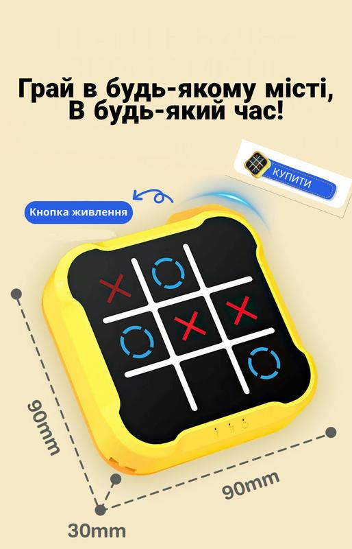 Настільна інтерактивна гра "Хрестики-Нулики" Кількість гравців:1-4людини Матеріал: ABS Вік: от 3 лет Живлення: 2 батарейки типа АА (не входять в комплект поставки) Размір: 90 x 90 x 28 мм Вага: 94 г Нашим підписникам ЗНИЖКА