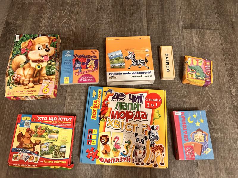 Ігри всі в гарному стані. Пазли усі є. Пазли з собачкою дуже великі.Підходять для дуже маленьких діток.Мінус в тому , що помялась сама коробка. З динозаврами теж помялась коробка. В книжці з пазлами на одній сторінці не вистачає пазла. За усі ігри/пазли-200 грн.