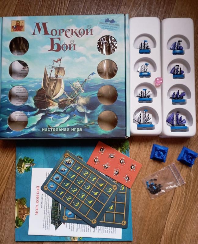 Настольная игра Морской бой - идеальное состояние (один раз в использовании). В комплект входит 2 набора кораблей с парусами разных цветов (два цвета из четырех возможных: белый, красный, желтый или фиолетовый). Флот каждого из двух игроков – это 4 корабля: Линкор, Галеон, Фрегат и Бриг. Каждый из них имеет определенные свойства по перемещению по карте и выстрелам. В один ход у каждого игрока есть возможность переместить весь свой флот и выстрелить (если "подстаешь" к кораблям противника). Цель игры - разбить флот соперника или захватить его крепость. Карта моря двусторонняя, благодаря чему каждая новая партия игры на двоих "Морской бой" не похожа на предыдущий!