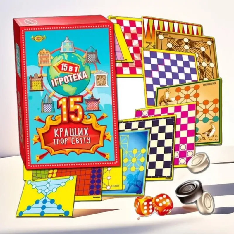 Комплект из 15 настольных игр для всей семьи! Шашки, нарды, уголки, мельница, уноретта, алькерк, лиса и гусы, самураи, кегли, крепость, теко, сигая, беттл, джамперс + бонус: да-токль! Отличный отдых и «разминание» интеллекта! Варианты игр для всех возрастов и настроения! Просто и компактно! Незаменим для отдыха дома и в дороге! Комплектация: поля игровые для 15 игр; кубики игральные – 2 шт.; шашки(фишки) игральные – 30 шт.; правила игр на русском и украинском языках.