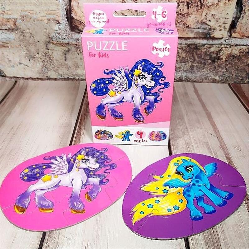 🕯 Вік: 1+ 🛍Комплектація: набір із 2 двосторонніх пазлів (на 4 і на 6 елементів). 📏Розміри: 🔹пазла: 14-16х10,5 см; 🔹коробки: 15,5х9х2,5 см. 🧰Матеріал: твердий картон. 🛠Виробник: Данко-Тойс. Набір "Поні" містить пазл із 4️⃣ і 6️⃣ великих та міцних елементів, на обидві сторони яких нанесено яскравий малюнок.