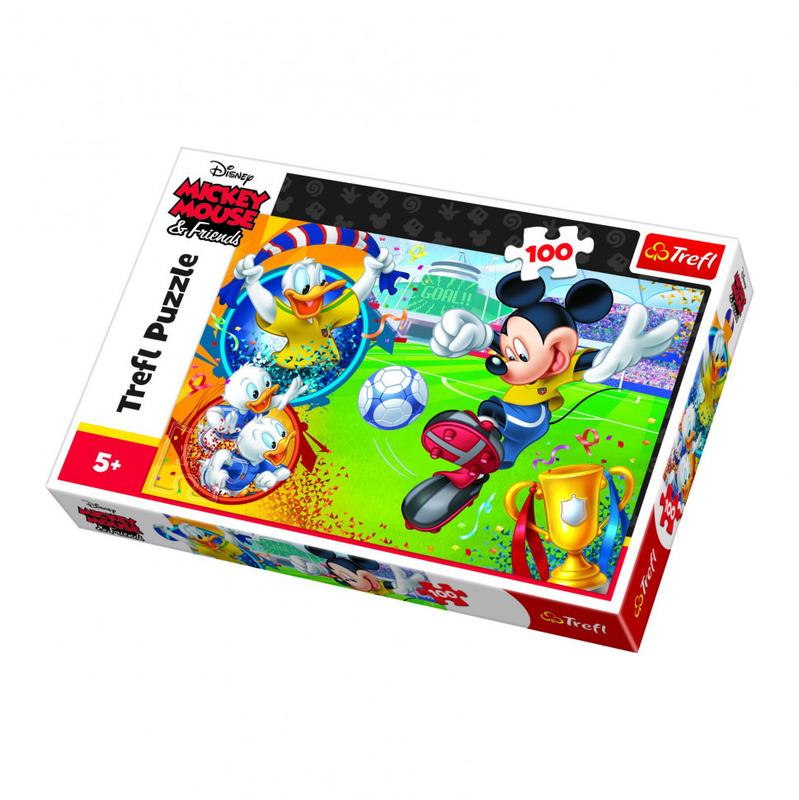 Пазлы на 100 элементов с изображением культовых персонажей мультипликационного сериала Уолта Диснея "Микки Маус и его друзья" во время футбольного матча на стадионе. В собранном виде размер картинки составляет 41*28 см. Высокое качество, насыщенность цветов и безопасность при собирании пазлов обеспечивает специальный каландрированный картон, который отражает свет и покрыт экологическими красками.