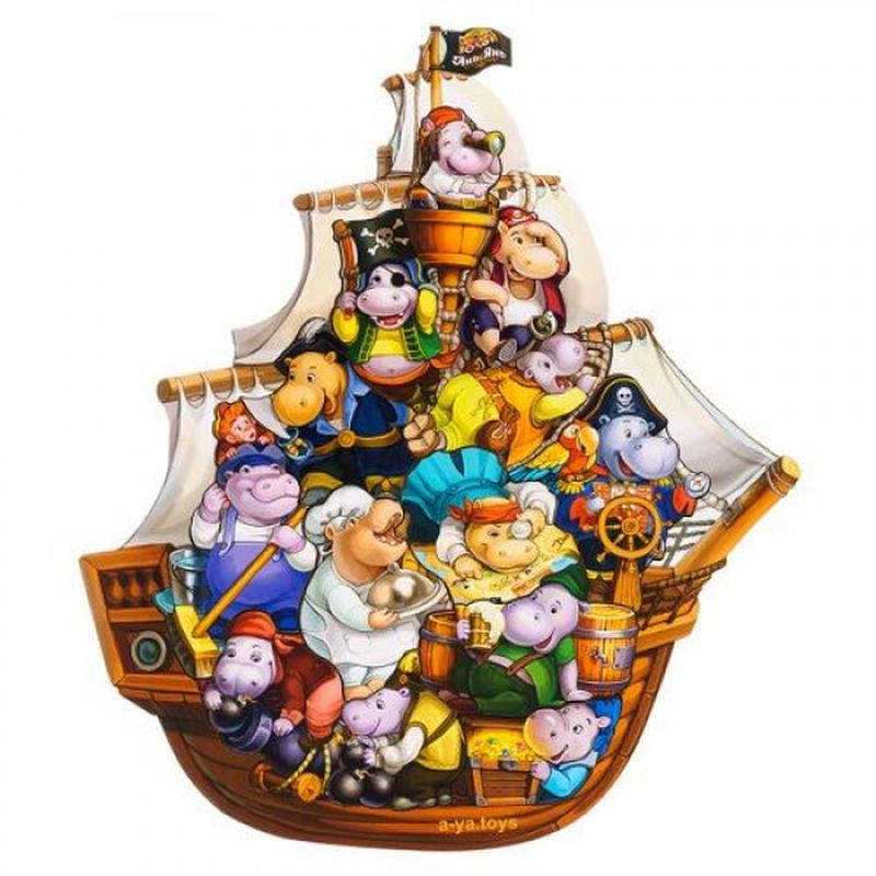 Пазл-вкладыш "Бегемотики-пираты". Пазл состоит из рамки-корабля и 13 пиратов- бегемотиков, распределенных по контурам. Необходимо сосчитать и правильно собрать всех бегемотиков на корабль. Размер рамки 31,5х27 см
