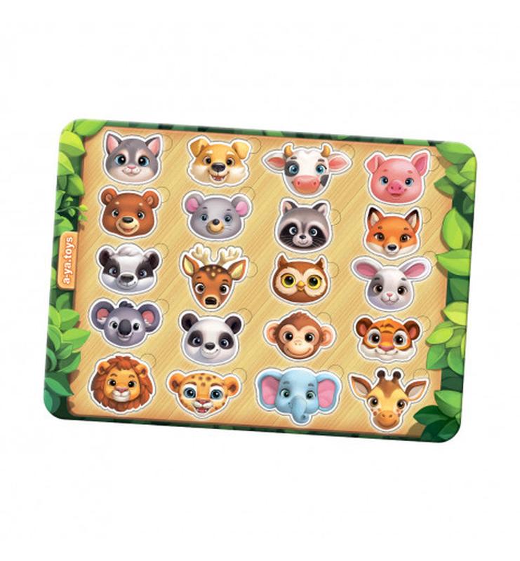 Пазл-сортер Мордочки, на планшете, 33*24см, ПСФ084. На планшете находятся 20 милых мордочек разных животных. Посчитайте зверей и поговорите с ребёнком о том, кто какие звуки издаёт и что любит есть. Сортируйте животных на "диких и домашних", "больших и маленьких". Мордочки удобно доставать пальчиками и вкладывать в основу по индивидуальной форме.