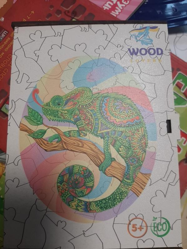 Дереяны пазлы в виде животных отлично складываются в картину Хамелеона Интересная, развивающая форма игры задача не из простых, но увлекательно