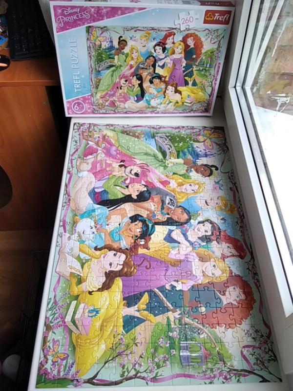 Trefi пазл принцессы 260 деталей в очень хорошем состоянии. Все целое. Все детали на месте. Коробочка совсем немного повреждение с одного края - видно на фото.