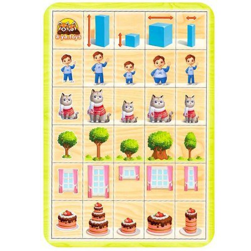 Планше-основа на котором размещены: 4 плашки со схематическими изображениями предметов, 4 плашки со стрелками-размерами, 16 плашек для сортировки. Ребенку необходимо расположить предмет в нужной графе и указанном положении, соответственно направлению стрелок, обозначающих сравнительные размеры предметов. Игра помогает развитию навыков произвольно-зрительного восприятия величины, внимания._ Бренд: Ubumblebees Упаковка: Пленка Цвет: Разноцвет Вес в упаковке: 400 г Габариты в упаковке: 0.5 x 32 x 23 см Cтрана производитель: Украина Материал: Дерево Комплектация: Пазл-сортер