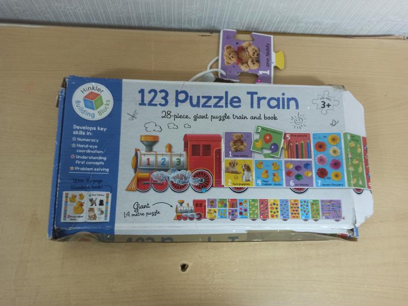 Научиться считать весело с Building Blocks: 123 Puzzle Train. Этот пазл из 28 частей состоит из большого пазла длиной 57 дюймов, который включает цифры, слова-цифры и яркие увлекательные картинки для счета. . Отличный способ улучшить навыки чтения, счета, моторики, решения задач и координации рук и глаз для детей старше 3 лет. Размеры готового пазла: 145 см. коробка повреждена, очень хорошего качества.