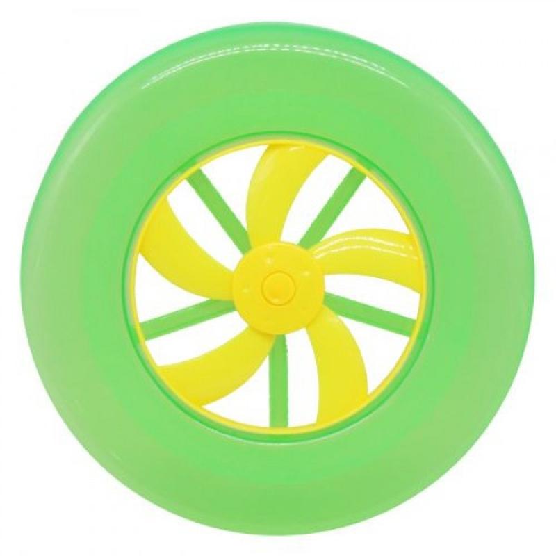 Большая летающая тарелка (фрисби) из прочного пластика. Тарелка сделана таким образом, что при полёте создается подъёмная сила, которая позволяет бросать их на значительные расстояния и с большой точностью. Также к фрисби прикреплен яркий пропеллер, который вращается во время полета. Диаметр: 22.5 см.
