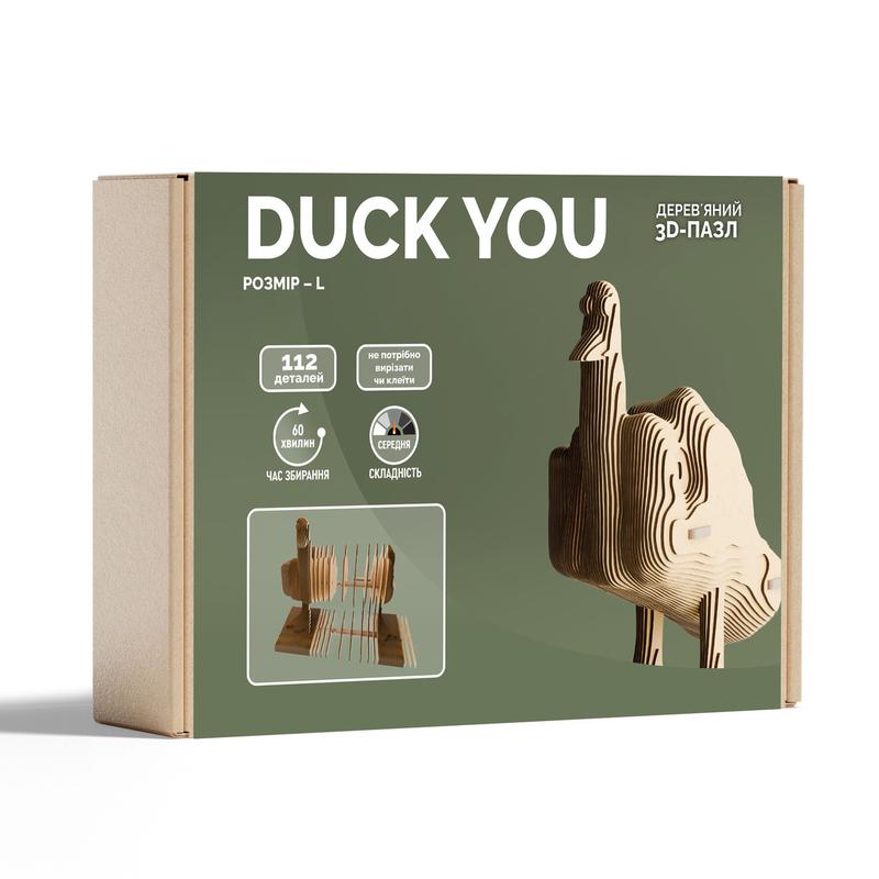 3D пазл-скульптура DUCK YOU! Вызовите улыбку с нашим неординарным 3D пазлом DUCK YOU Этот увлекательный пазл создан из нанизываемых на направляющие деревянных деталей, что позволяет вам воспроизвести веселый образ утки, выражающий свое отношение с неуважением. Вы создаете скульптуру, которую можете раскрасить и добавить цветов в ваш дом или оставить так в крафтом виде. Каждая деталь изготовлена из HDF - надежного и экологичного материала, обеспечивающего долговечность и безопасность вашего творческого процесса. Интересный факт: Утки - это очень интересные животные, имеющие много интересных особенностей. Например, они могут летать, плавать и ходить по земле, и они имеют очень гибкий клюв, который помогает им искать пищу в воде и на суше. Соберите этот уникальный пазл и добавьте к вашему интерьеру элемент юмора! Материал: высококачественный HDF и деревянные направляющие. Размеры (в собранном виде): 20х15х13см Рекомендовано для: Возраст от 6 до 99 и старше Включает: 106 деталей и три направляющих. Примечание: Каждый пазл тщательно изготовлен, что обеспечивает уникальный и приятный опыт сборки. Из-за того, что изделие производится вручную, возможны незначительные различия в текстуре и цвете древесины, что придает ему шарм и индивидуальность.