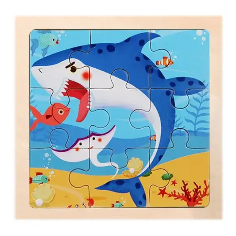 Деревянный пазл состоит из 9 деталей и рамки основания. Комплект упакован в прозрачную полиэтиленовую плёнку. Элементы пазла изготовлены из натурального дерева, покрытого яркими и безопасными красками. Размер комплекта - 11 см х 11 см