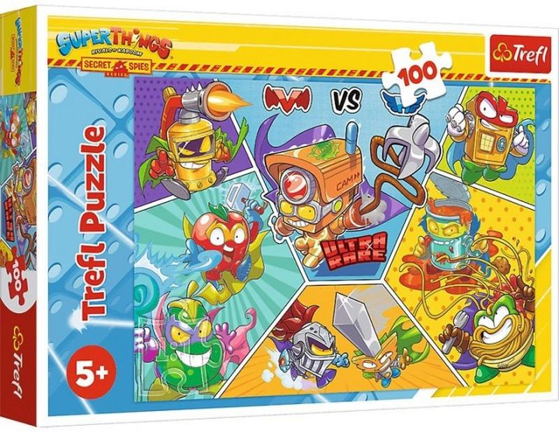 Пазли на 100 елементів із зображенням колекційних фігурок-шпигунів "SuperThings" - головних персонажів шостої серії анімаційного серіалу "SuperZings" про побут фігурок і предметів від іспанського виробника Magic Box, які живуть своїм особливим життям. У складеному вигляді розмір картинки складає 41 * 28 см. Високу якість, насиченість кольорів і безпеку при збиранні пазлів забезпечує спеціальний каландрований картон, який відображає світло і покритий екологічними фарбами.