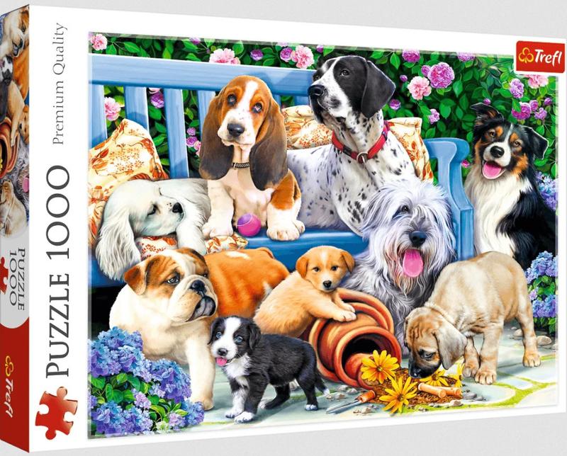 Пазл, состоящий из 1000 элементов Собачки в саду. После расстановки будет создана картинка размером 68 х 48 см. Высокое качество, насыщенность цвета и безопасная сборка обеспечивается каландровой светоотражающей бумагой, покрытой экологичными пищевыми красками.