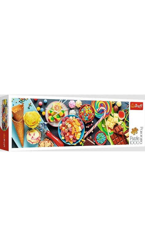 Панорамный пазл с 1000 деталей Сладости. После сборки пазла будет создана картинка размером 97х34 см. Высокое качество, насыщенность цвета и безопасная сборка обеспечивается каландровой светоотражающей бумагой, покрытой экологичными пищевыми красками.