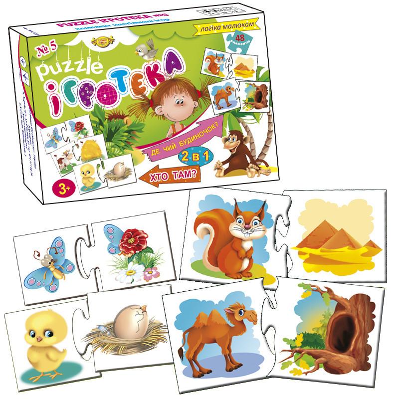 Комплект настольных игр («КТО ТАМ?», «ГДЕ ЧЕЙ ДОМИК?»). Мы объединили в PUZZLE-ИГРОТЕКЕ две самые популярные игры серии «ЛОГИКА МАЛЫШАМ» . «КТО ТАМ?» — логическая игра для самых маленьких — НАЙДИ, КТО ГДЕ СПРЯТАЛСЯ! «ГДЕ ЧЕЙ ДОМИК?» — во время увлекательной игры малыш знакомится со зверятами, птичками, насекомыми и их «домиками». Игры способствуют развитию логического и образного мышления ребенка, учат наблюдательности и умению соотносить часть и целое, развивают сенсорику и мелкую моторику рук, что особенно важно для развития речи и интеллектуальных способностей. Подробные правила и варианты игры на русском и украинском языках находятся в коробке. Комплектация: 48 элементов PUZZLE (24 пары); правила игр на рус. и укр. языках.