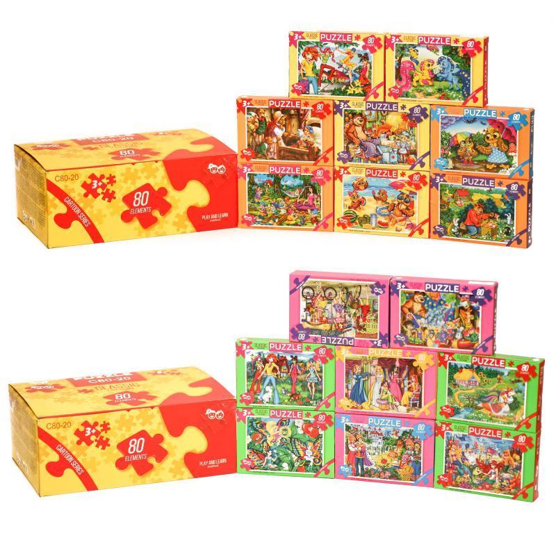 Дитячі пазли, мікс видів. Яскраві кольори. 80 деталей стандартного розміру. Матеріал - картон. Упаковка - коробка. Розмір - 13х2,5х9 см.