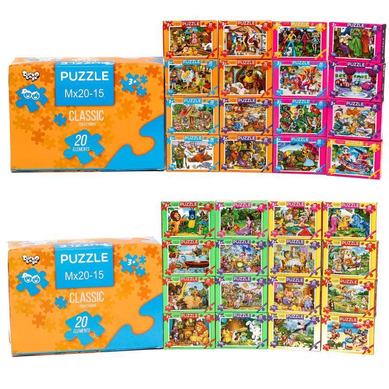 Дитячі пазли, мікс видів. Яскраві кольори. 20 деталей великого розміру. Матеріал - картон. Упаковка - коробка. Розмір - 9х2,5х6,5 см.