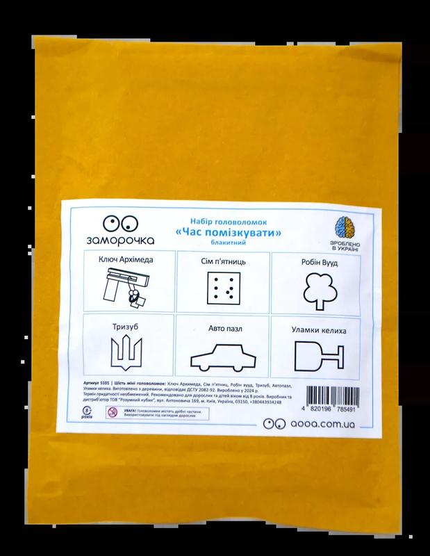 Набор Заморочок "Время поразмыслить" (голубой) - удобный формат для того, чтобы всегда иметь под рукой источник разумных развлечений и с пользой провести время - в пути, на работе, дома.В набор вошли головоломки разных уровней сложности, поэтому подойдет как начинающим, так и любителям. В набор входят: Ключ Архимеда, Семь пятниц, Робин Вууд, Трезубец, Авто пазл, Обломки бокала. Заморочка - коллекция интересных мини-головоломок из дерева украинского производства, тренирующая логику, внимательность и креативное мышление. Каждая головоломка данной серии имеет свой дизайн и оригинальное решение, а также дополнительную задачу на оборотной стороне упаковки. Станет хорошим презентом, сувениром и развлечением как для офиса, так и семейного досуга.